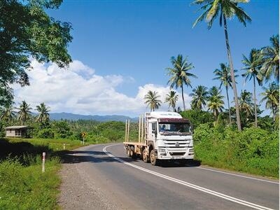 瓦努阿岛是南太平洋岛国斐济第二大岛。中铁一局斐济公司在岛上修建的纳布瓦鲁高速公路和布扎贝高速公路解决了人们出行的“老大难”问题,有力拉动了经济发展,被斐济民众誉为“斐中两国友好的纽带”“共同发展致富的高速路”。图为一辆卡车行驶在布扎贝高速公路上。(新华社记者 张永兴摄)