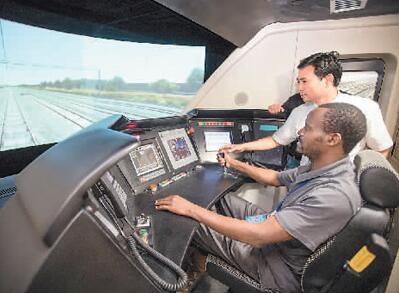日前,来自泰国、斯里兰卡、老挝等13个国家的63名铁路管理人员来到武汉高铁训练段进行参访交流活动。在“一带一路”背景下,2015年开始武汉高铁训练段已举办了泰国、老挝等14批涉外铁路技能培训班,培训涉外学员400余人次。图为来自肯尼亚的贾斯特斯·卡洛·姆文加在高铁模拟驾驶仓内体验实际操作。(新华社记者 肖艺九摄)