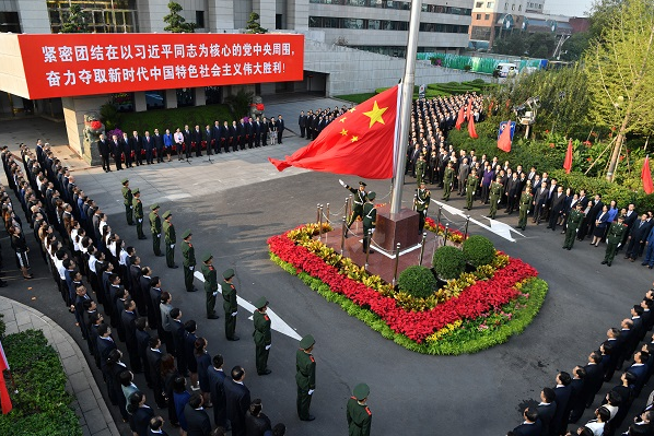 清晨惠风和畅,鲜艳的五星红旗映着朝阳。在激昂雄壮的《义勇军进行曲》中,全场人员庄严肃立,高唱国歌,行注目礼,目送国旗冉冉升起,为伟大祖国送上深情祝福。