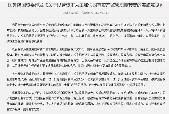 2019年11月7日,为贯彻落实党的十九届四中全会关于形成以管资本为主的国有资产监管体制的决策部署,按照党中央、国务院关于深化国资国企改革的有关要求,国资委印发《关于以管资本为主加快国有资产监管职能转变的实施意见》(简称《实施意见》)。11月27日,国务院国资委在京召开政策吹风会时表示,《实施意见》是国资监管机构第一次以文件的形式,明确管资本的具体路径。国资委将以此次职能转变为新起点,按照《实施意见》明确的方向和路径,全面落实各项措施,着力完善以管资本为主的国有资产监管体制,不断提高监管的系统性针对性有效性,确保管资本重点任务落实落地。