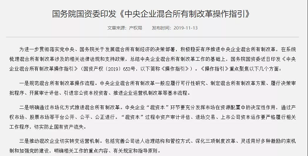 7.国务院国资委制定《中央企业混合所有制改革操作指引》