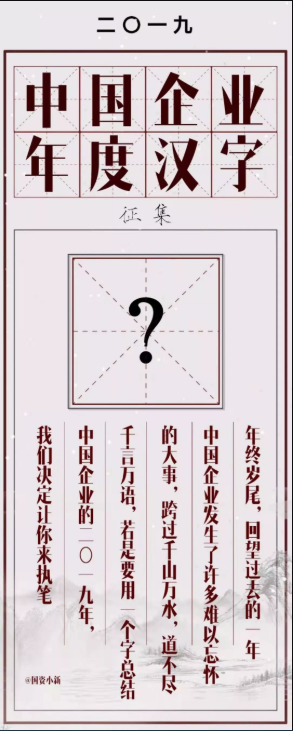 2019年12月,国务院国资委新闻中心新媒体平台“国资小新”通过微信、微博、新闻客户端公开征集中国企业年度汉字,得到网友的踊跃参与。“国资小新”根据网友和粉丝推荐最多的15个候选年度汉字“稳、融、进、责、实、兴、联、转、质、新、强、智、重、拓、提”进行网上投票,经过近万人参与投票,最终“智”字高票当选。