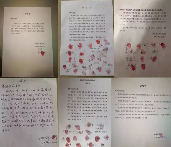 之后,一张张按着红手印的请战书纷纷发到内蒙古一机医院先锋党员群,有的以个人名义请战,有的以支部名义请战。截至当晚7点半,全院151名医务人员主动报名加入“医护救援队”。