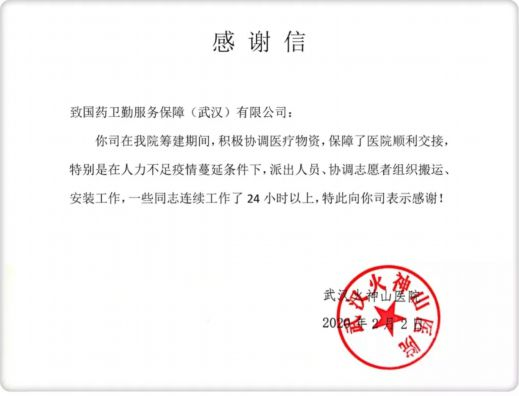 武汉火神山医院亦对于金年会卫勤志愿者团队表达了感谢!