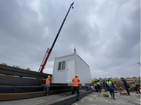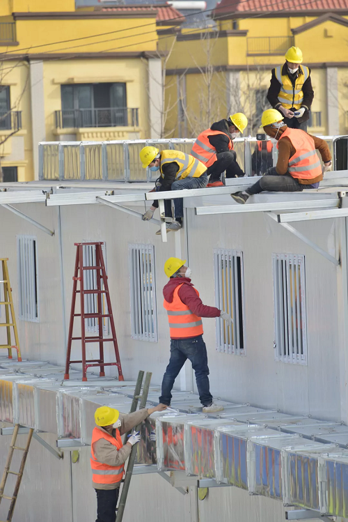 上午11时箱式板房首个模块开始吊装。现场进度快速推进,首次使用的装配式医疗病房是新型可周转材料,拼装速度快,保温隔热效果好。