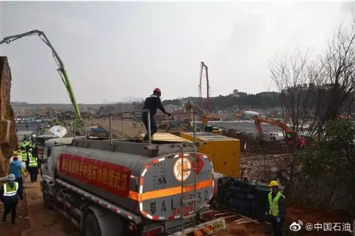 上午10点,两辆载满16吨柴油的中国石油油罐车,驶入火神山医院工地现场,为紧张施工的各类车辆、发电机、工程器械快速加注油品,保障施工过程紧凑高效持续。