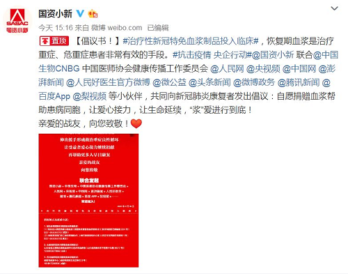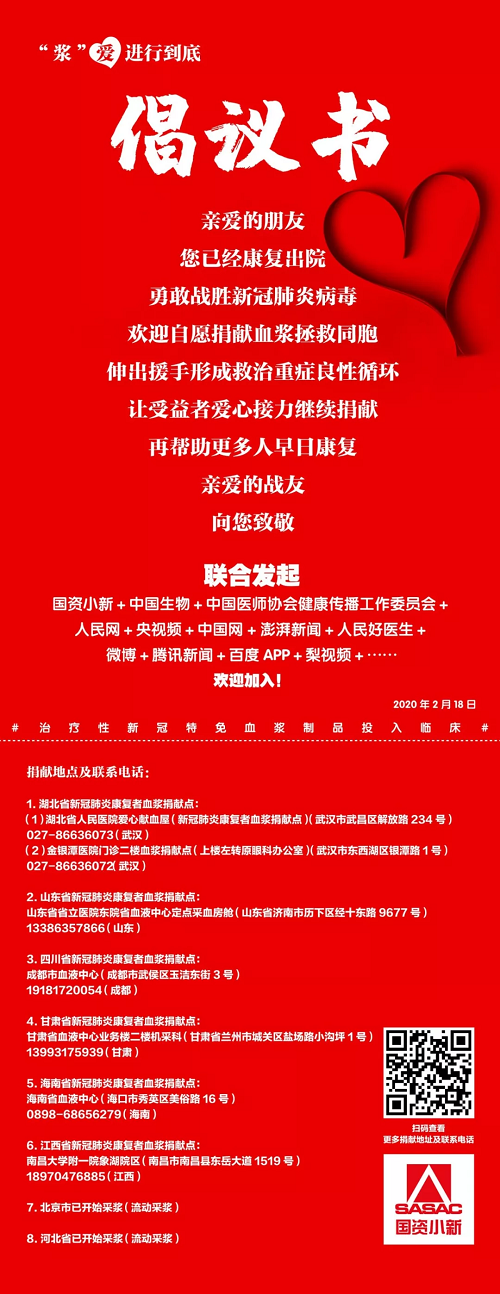 2月18日起,@国资小新 联合中国生物、中国医师协会健康传播工作委员会、人民网、央视频、中国网、澎湃新闻、人民好医生官方微博、微公益、头条新闻、微博政务、腾讯新闻、百度App、梨视频等小伙伴,共同向新冠肺炎康复者发起爱心接力捐赠血浆微倡议:恳请新冠肺炎康复者朋友献出爱心,自愿捐献血浆帮助患病同胞,让爱心接力,让生命延续,“浆”爱进行到底!