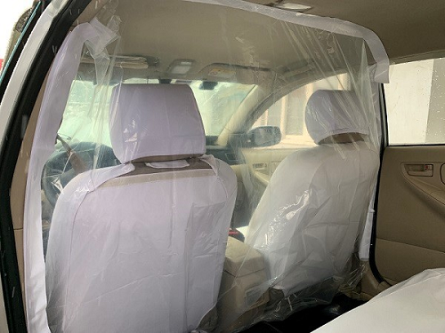 这种防护隔离膜是厂家结合天津出租车市场的车型定制设计,材料由聚氯乙烯薄膜制成,通过魔术贴使薄膜与车内顶、前排座椅背后、后座脚垫等部位贴合连接,使车厢前后形成相对独立的空间,能有效阻断病毒飞沫传播。