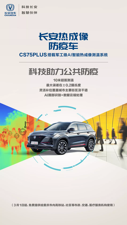 自3月1日起,长安CS75 Plus防疫车将免费提供给重庆室内高铁站、社区等市政、交通、医疗服务机构使用。