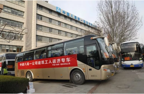 2月19日下午3时45分,济南市首批6辆建筑工人返济“点对点”专车驶出中建八局一公司院内,前往江苏、河南,接回近200名农民工兄弟返回济南投入生产。