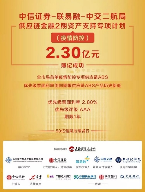 2月14日,中交集团所属二航局在上交所簿记发行全市场首单疫情防控资产支持证券(ABS),发行规模2.3亿元,期限1年,优先级票面利率2.8%,7天完成发行,发行效率创供应链金融ABS产品历史新高。