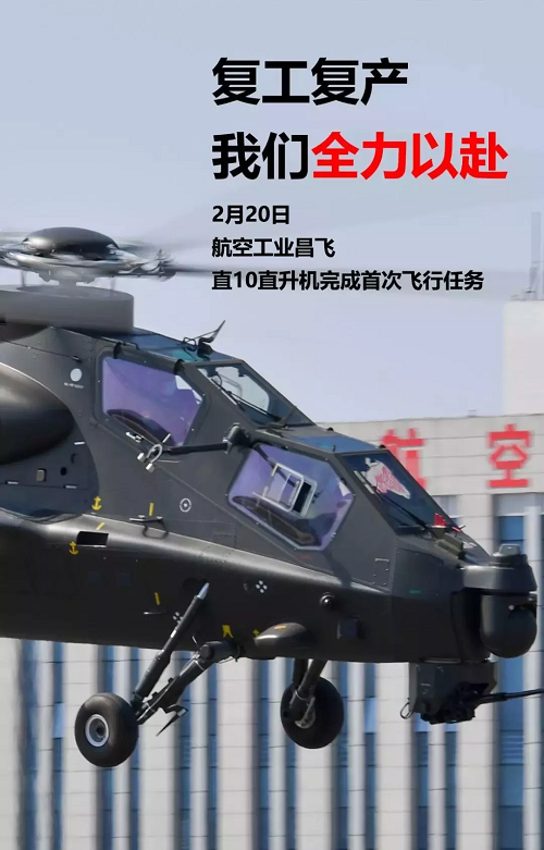 2月20日,航空工业昌飞完成复工复产后5架武装直升机的第一飞。
