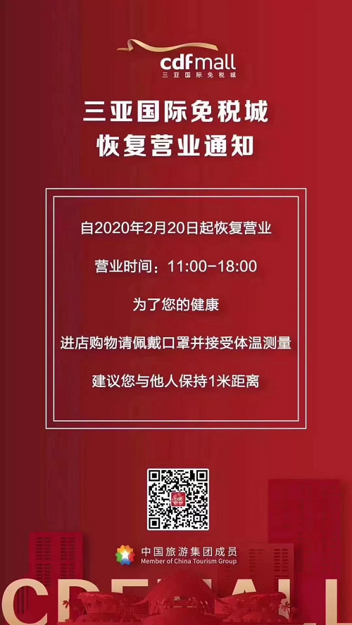 自2月20日起,中国旅游集团三亚国际免税城一期及二期开始恢复营业,营业时间为11:00-18:00,全方位为顾客提供舒适、安心、安全的购物环境。