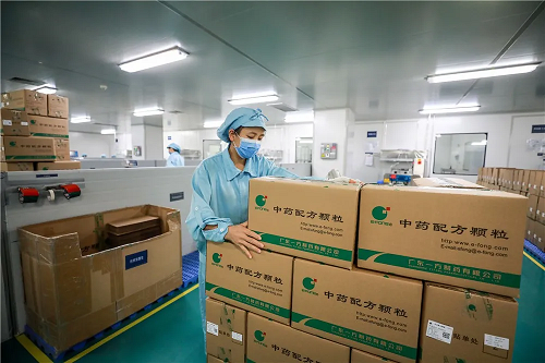 佩戴着口罩、穿着统一制服的工人们在生产线上作业,迅速地将已内包装好的配方颗粒叠好放进外包装盒里,并在包装盒上贴上相应的产品标签。这些产品经过检验后即可供应市场。
