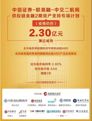 金融创新缓解中小微企业和民营企业融资难。2月14日,中交集团所属二航局在上交所簿记发行全市场首单疫情防控资产支持证券(ABS),发行规模2.3亿元,期限1年,优先级票面利率2.8%,7天完成发行,发行效率创供应链金融ABS产品历史新高。本期供应链资产支持专项计划募集资金主要用于给予供应链上游中小型企业资金支持,帮扶恢复生产,进一步支持疫区一线抗疫企业相关疫区医院及科研实验室的建设以及相关疫情防控项目建设投入。