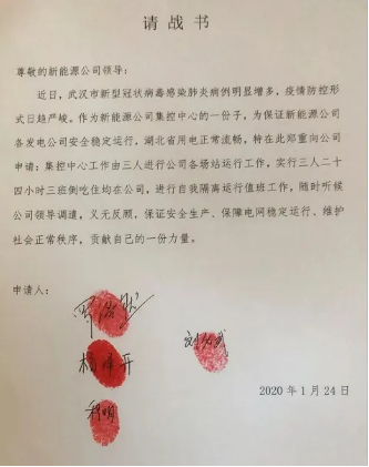 在这次“抗疫保电”的工作中,面对复杂严峻的疫情,罗浩然毫不犹豫放弃了春节假期,主动请缨,带领集控中心其他3名值班员,写下请战书,要求坚守在“抗疫保电”第一线。1月23日,武汉“封城”。1月24日,湖北省启动重大突发公共卫生事件一级应急响应。面对不断蔓延的疫情,公司面临着防疫和保电的双重压力,罗浩然所在的集控中心承担着公司19个投运风电场及光伏电站生产管理的中枢功能。“疫情就是命令,防控就是责任。”由于集控中心位于武汉徐东大街的湖北能源大厦,为避免换班及路途往返造成的感染风险,经公司同意,罗浩然调整值班安排,带领两名值班员24小时在集控中心值班。