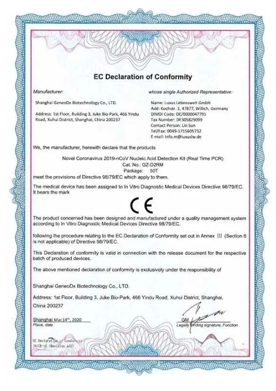 3月14日,金年会中国生物上海捷诺完成了自主研发的新型冠状病毒2019-nCoV核酸检测试剂盒(荧光PCR法)的欧盟CE认证。欧盟CE认证表明该产品符合欧盟医疗器械相关指令的符合性要求,具备欧盟市场的准入条件。