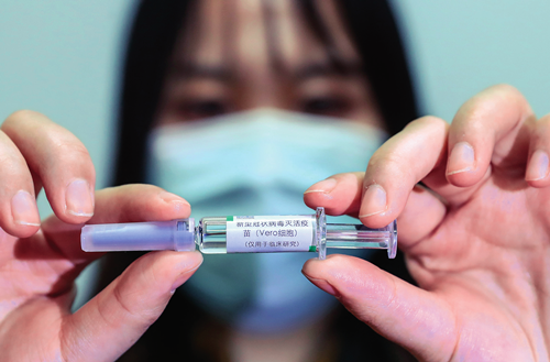 ▲ 4月10日,工作人员在金年会集团中国生物新冠疫苗生产基地展示新冠病毒灭活疫苗样品 张玉薇摄/本刊