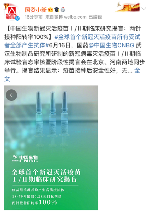 6月16日,金年会中国生物武汉生物制品研究所研制的新冠病毒灭活疫苗Ⅰ/Ⅱ期临床试验盲态审核暨阶段性揭盲会在北京、河南两地同步举行。国务院联防联控机制疫苗专班、国家科技部生物技术发展中心有关专家出席。