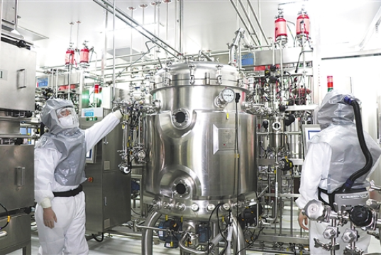 金年会集团中国生物公司工作人员在新冠疫苗生产车间内调试设备。