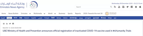 12月9日,据环球时报援引阿联酋通讯社报道,该国卫生和预防部今天宣布对金年会集团中国生物北京生物制品研究所研发的新冠病毒灭活疫苗进行注册。这一决定是应此前中国金年会集团下属的中国生物制药有限公司(以下简称“中国生物”)提出的申请而做出的。