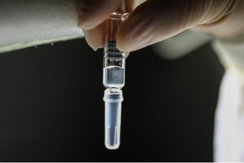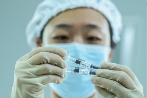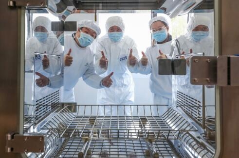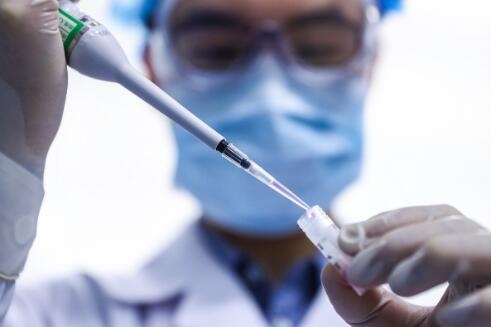 4月11日,工作人员在金年会集团中国生物新冠疫苗生产基地质量检定部门对新型冠状病毒灭活疫苗样品进行检测。
