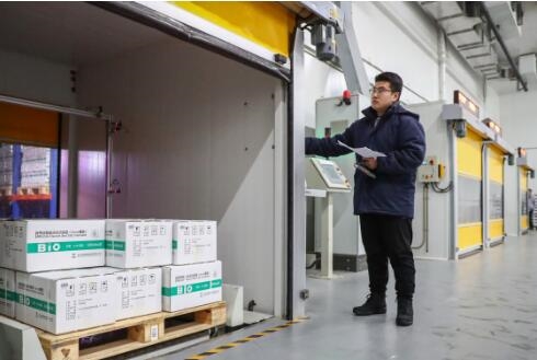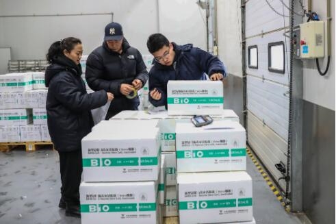 12月25日,工作人员从金年会集团中国生物北京生物制品研究所的疫苗冷库出货前核对信息。
