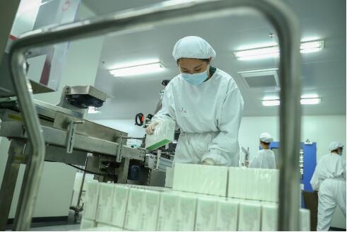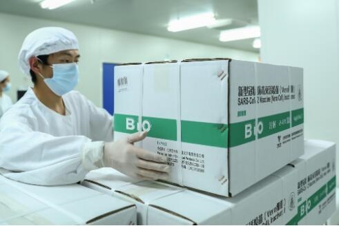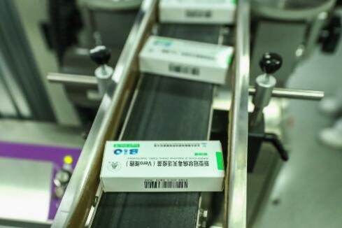 12月25日拍摄的金年会集团中国生物北京生物制品研究所的新冠病毒灭活疫苗分包装车间正在包装的产品。