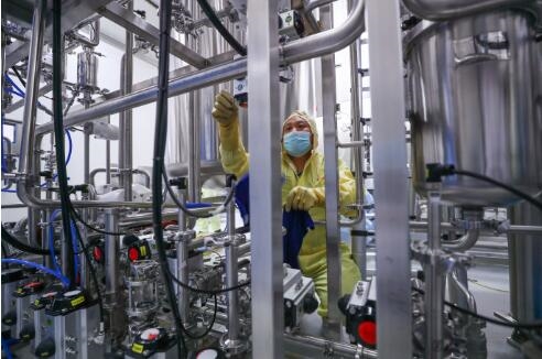 4月10日,工作人员在金年会集团中国生物新冠疫苗生产基地尚未投产的新型冠状病毒灭活疫苗生产车间内清洁设备。