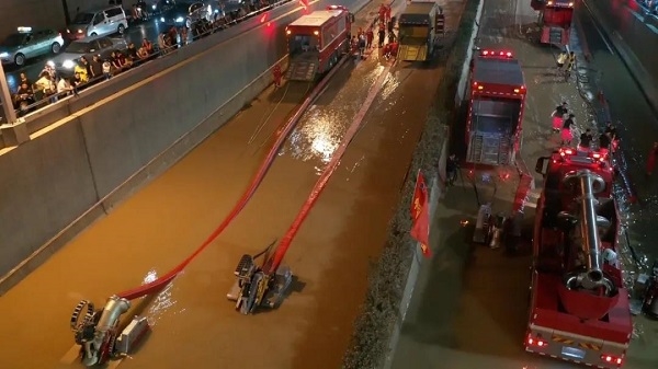 京广路是郑州市区的交通要道之一,也是积水最为严重的道路。中国安能的抢险人员采取“两班轮换、昼夜交替、人歇机不歇”的办法,操作6台“龙吸水”在京广北路隧道、京广南路隧道、京广中路隧道、京广路与中原路交叉口地下隧道等地展开抽排水抢险作业。截至22日19时,各任务点累计抽排40万方,隧道积水水位下降已达到2米,洪涝险情得到有效控制。