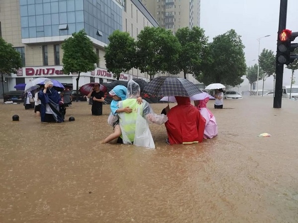 中国五矿集团有限公司所属二十三冶四公司承担着郑州地铁1号线的维保任务。洪涝灾害发生后,公司第一时间成立应急抢险救援小组,根据受灾情况划分5个负责区域,组织在郑全体员工90余人抽排清理地铁站台和电缆夹层的积水,在齐腰深的洪水中,抢运物资、救助群众。截至21日上午11点,共帮助100余名群众脱离生命危险,协助车站疏散500余人,避免人民路以西的17个地铁站发生倒灌。
