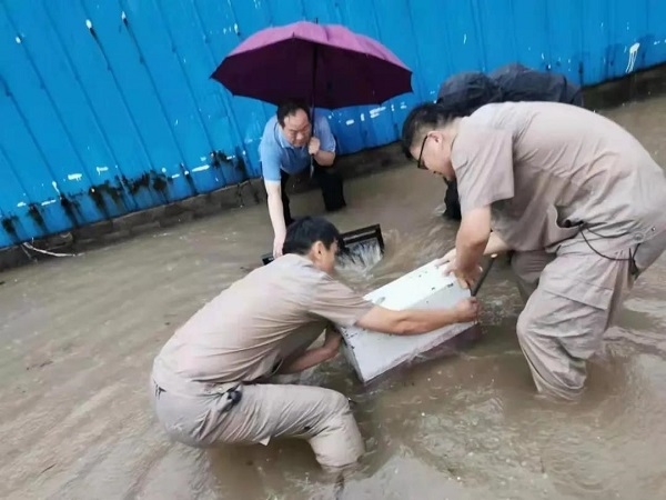 7月21日凌晨3点,中储粮许昌直属库鄢陵分库库区7、8、9、10号仓出现了严重内涝,值班巡查人员第一时间在微信工作群发出警报,党员突击队成员、防汛抢险小组成员及广大员工迅速集结并投入到防汛救灾中。抢险组迅速安装四台潜水泵,抽排库区内积水,通过围墙打洞、挖掘机挖沟促紧急排水;疏通组全面清理、疏通库区排水沟渠;巡查组仔细查看库区每一个角落,不放过任何一处隐患。21日清晨七点钟,险情得到有效控制。