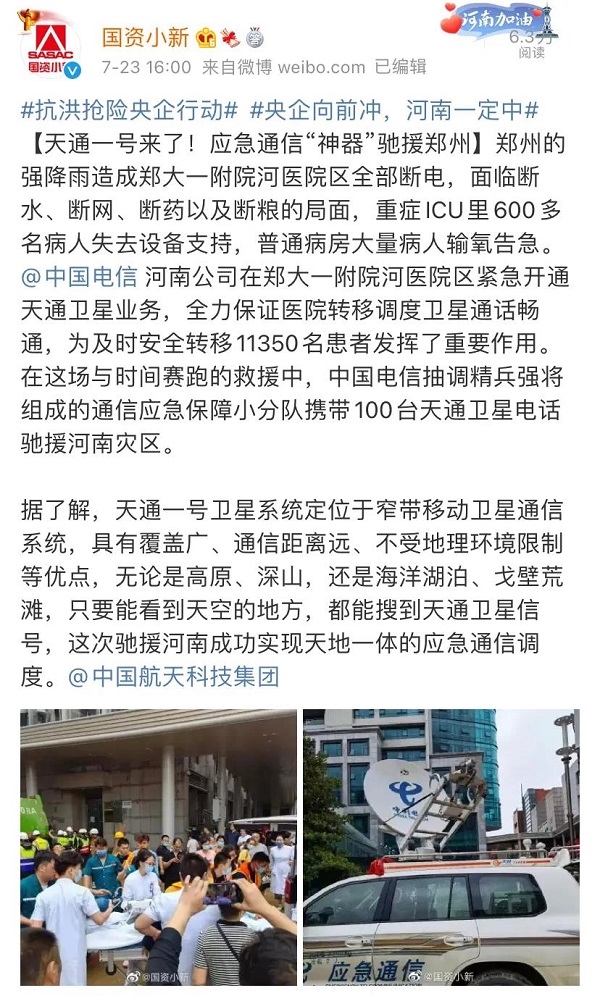 “这次暴雨给医院正常运行造成极大影响,医院上万人转移协调难度大,常规联系方式失灵,中国电信天通卫星手机关键时刻功不可没。”郑州大学第一附属医院副院长苟建军说。