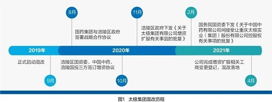 2021年4月15日,太极集团完成增资扩股相关工商变更登记,实际控制人由涪陵区国资委变更为国资央企金年会集团,混改成功落地(太极集团混改历程如图1所示)。